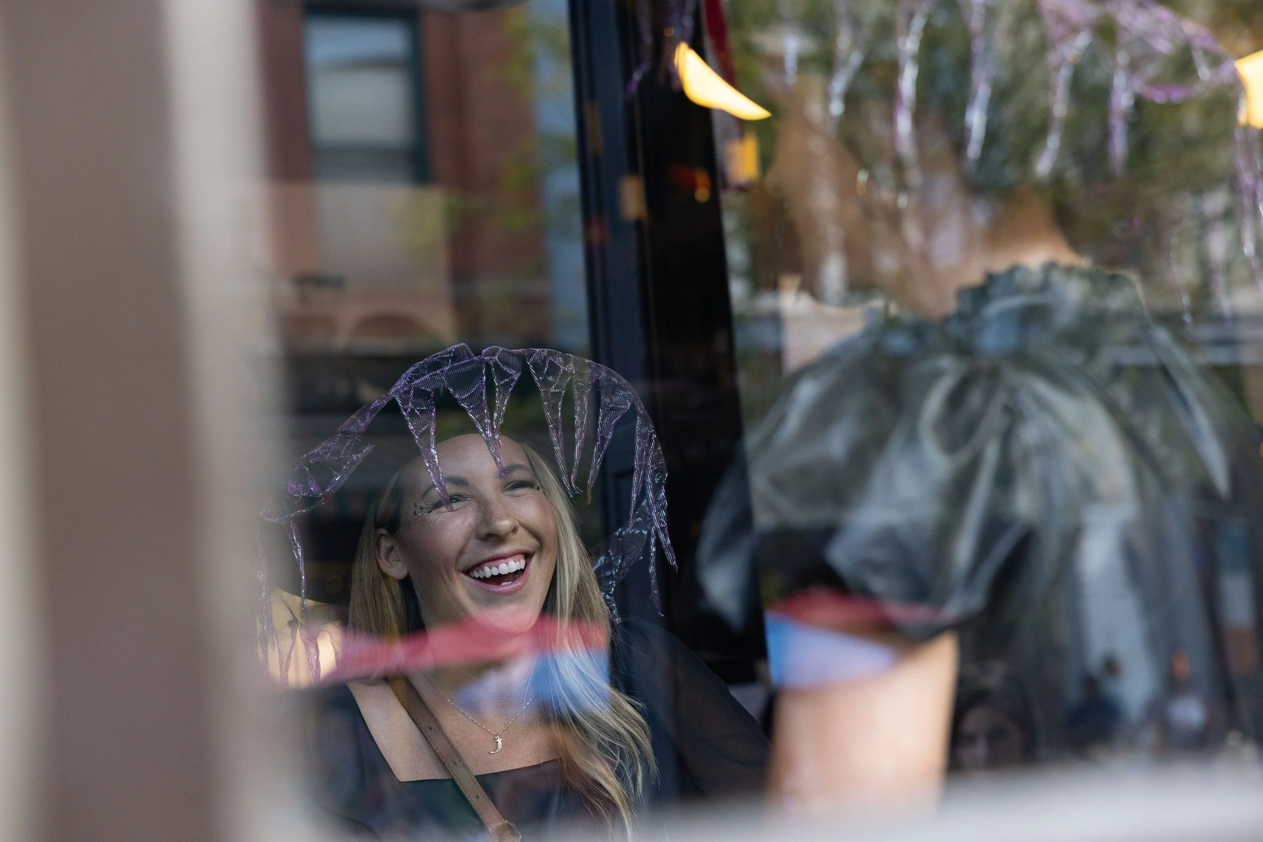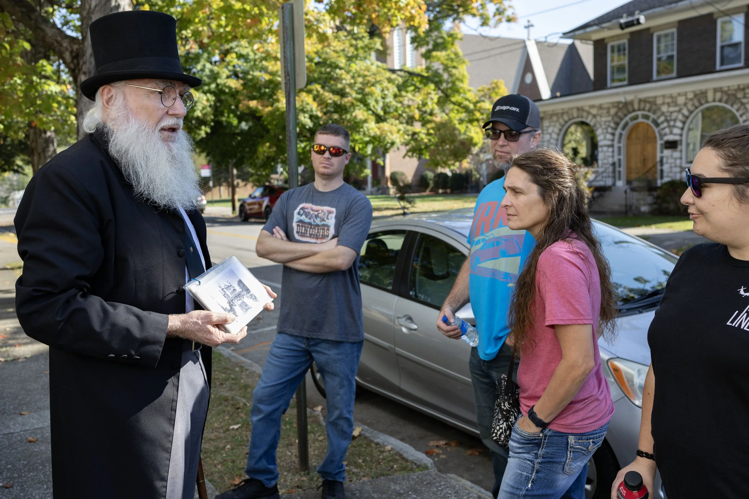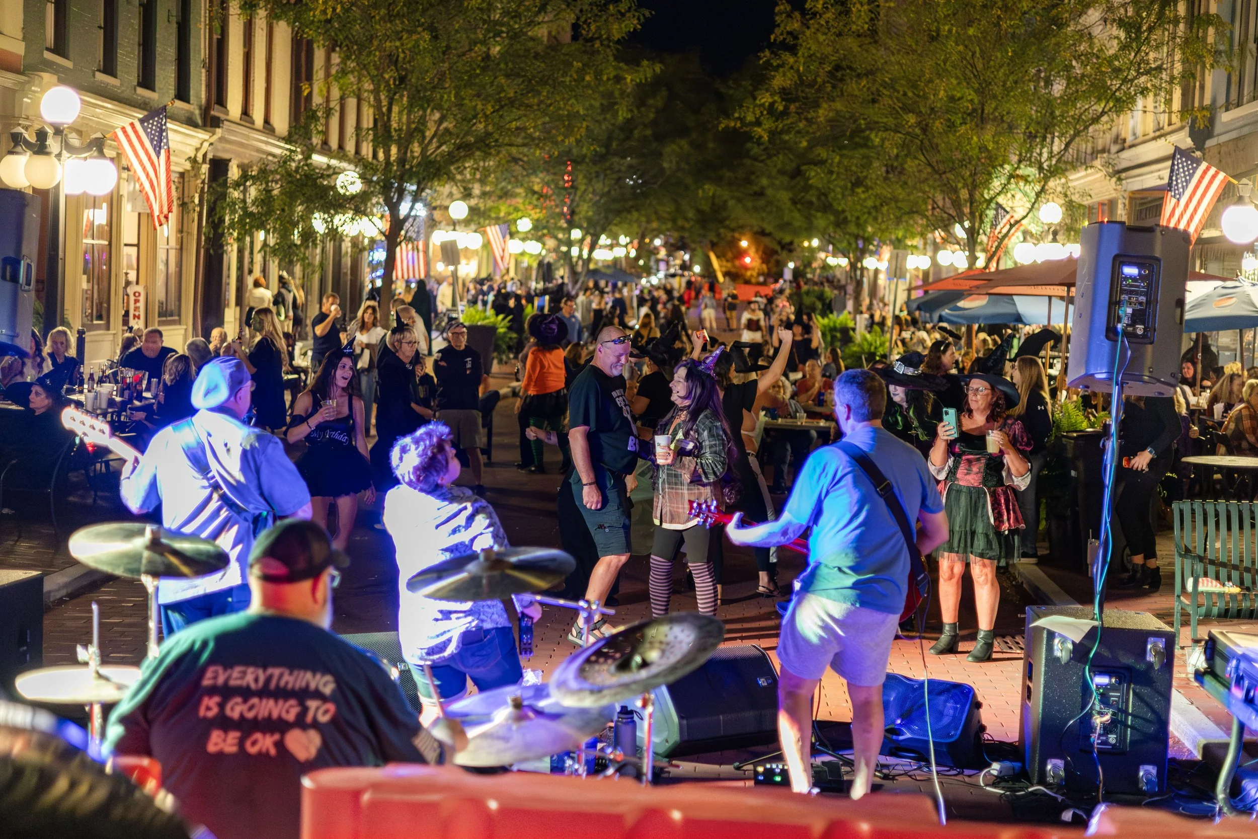 In downtown Frankfort, a friendly trolley driver invites riders aboard, regulars order their usual, a dog eats pizza scraps, witches cross the street, musicians jam together.